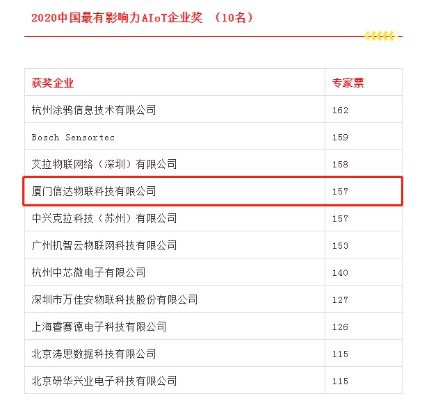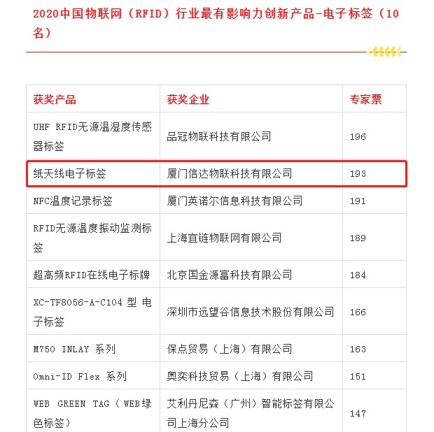 信達(dá)物聯(lián)歷經(jīng)大眾投票預(yù)熱、專家評(píng)委投票等環(huán)節(jié),摘奪“2020中國(guó)最具有影響力AIOT企業(yè)獎(jiǎng)”和“2020年中國(guó)物聯(lián)網(wǎng)(RFID)行業(yè)最具有影響力創(chuàng)新產(chǎn)品獎(jiǎng)”兩項(xiàng)桂冠。