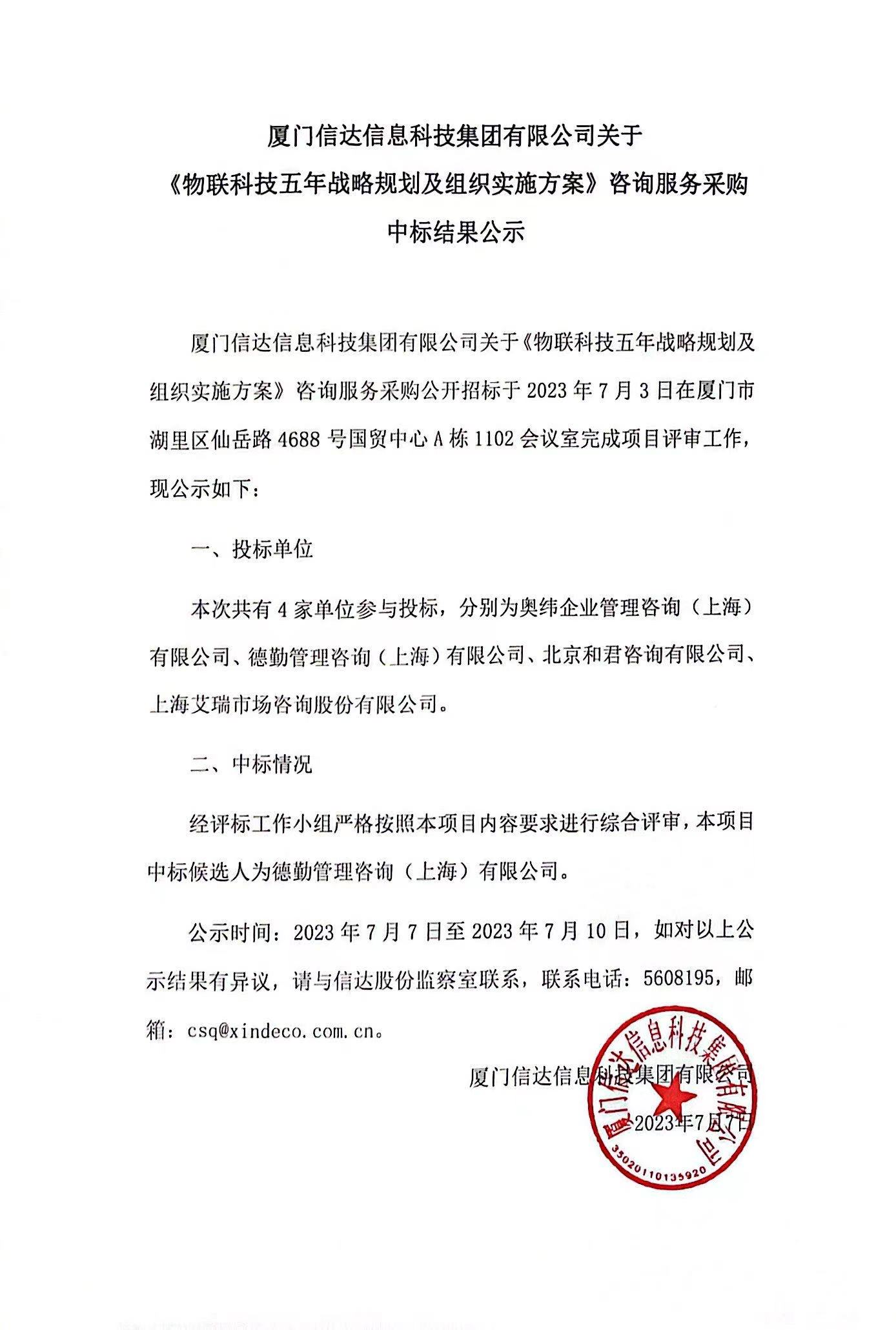 廈門信達信息科技集團有限公司關于《物聯科技五年戰(zhàn)略規(guī)劃及組織實施方案》咨詢服務采購中標結果公示